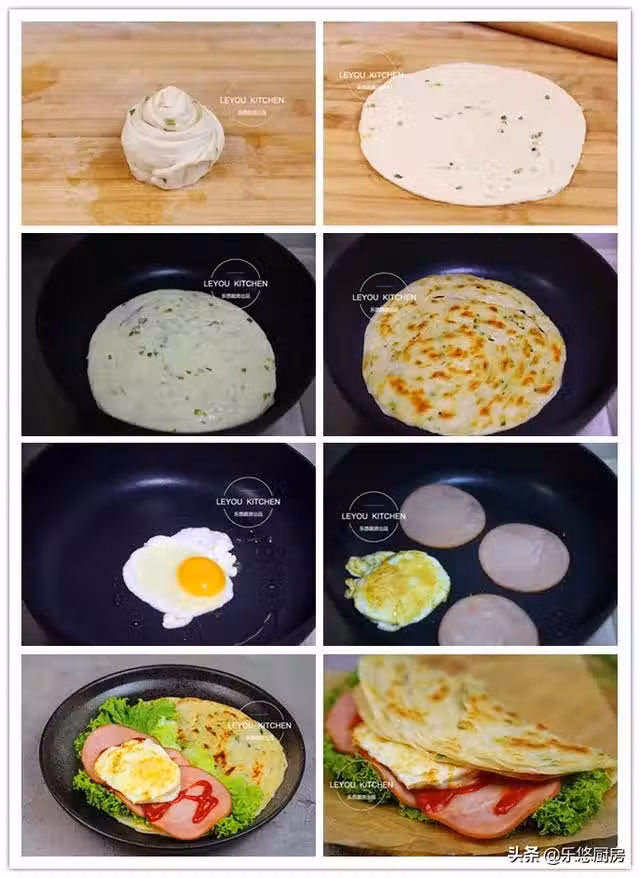 第十四步:雞蛋快成熟的時候,將火腿切片放入鍋中煎30秒,然後盛出備用。(大家也可以往餅里卷一些肉鬆、裡脊肉、火腿腸什麼的,這個隨自己愛好。)