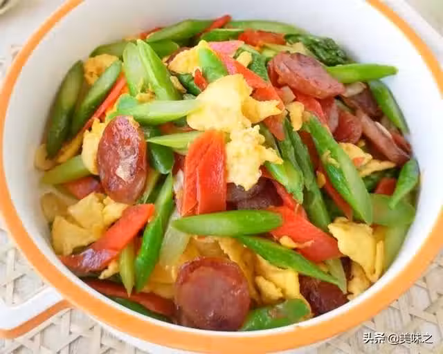 蘆筍5根、臘腸一根、胡蘿蔔半根、鴨蛋兩個、鹽適量、大蒜三粒、蔥一顆、生抽小半勺、花生油適量、料酒一茶匙。
