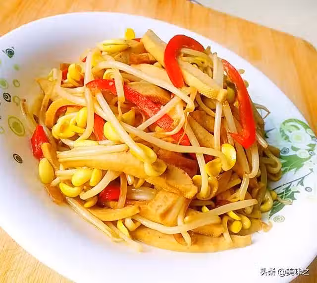 1、豆乾切片,大紅辣椒切絲,黃豆芽洗凈瀝干水份,蔥切蔥花,蒜切片。