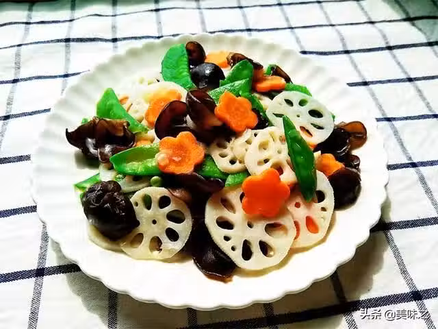 蓮藕適量、荷蘭豆適量、胡蘿蔔適量、木耳適量、玉米澱粉1g、雞湯20g、蔥適量、鹽適量、姜適量、蒜適量、辣椒適量。