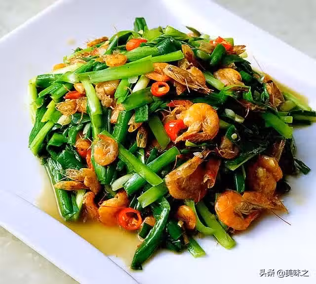 小河蝦200g、韭菜200g、小米椒適量、姜少許、蒜少許、鹽少許、花生油適量。
