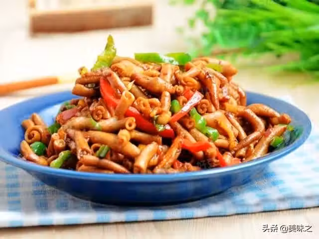 雞腸500g、青椒1個、紅椒1個、油適量、鹽適量、蒜瓣5個、大蔥1根、生薑適量、白酒10ml、老乾媽香辣醬1勺、生抽10ml、糖2g、雞精少許。