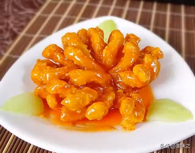5、漏勺浸入八成熱油里,迅速炸定型,撈出來,復炸一次。裡脊肉不要炸時間長,老了就硬,正好的才會吃起來外酥里嫩。
