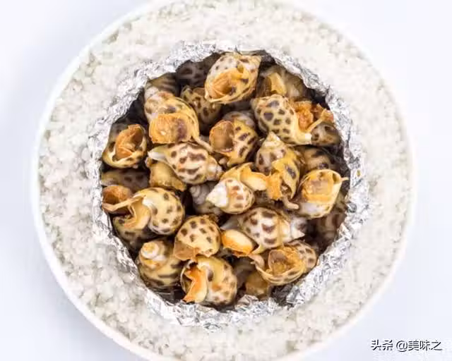 5、盛出花螺,用錫箔紙包裹緊實。把包好的花螺放入砂鍋中的粗鹽上,蓋上鍋蓋。中火燜3分鐘,即可享用。