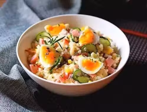 土豆 450g、洋蔥 1/3個、黃瓜 1/3個、丘比蛋黃沙拉醬 50ml、水煮蛋 3個、鹽 5g、醋 5ml、黑胡椒 2g、火腿片 50g、橄欖油 1勺