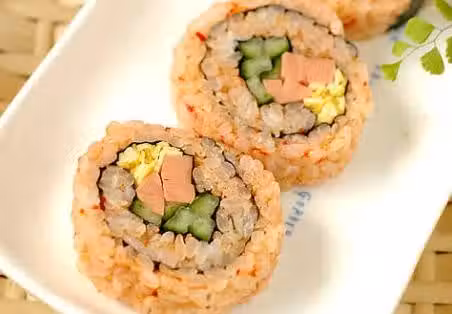 米飯 300克、雞蛋 3個、黃瓜 1根、火腿 1根、紫菜 適量、辣醬 適量