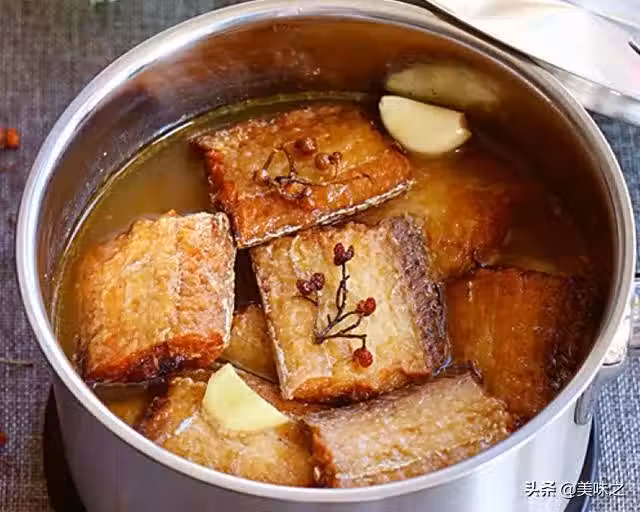 4、把煎好的魚塊放進燉鍋,放入八角、花椒、蔥段、薑片、醬油、醋和鹽。