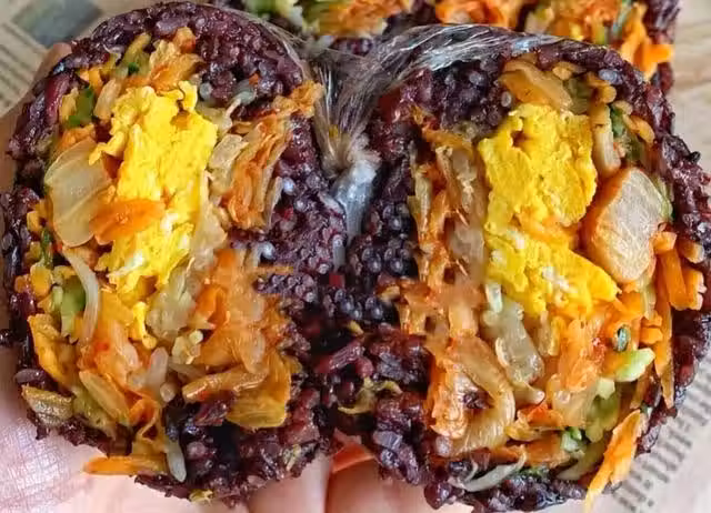 (3)案板上鋪好層保鮮膜,上面鋪一層蒸熟的紫米,再依次放入黃瓜絲、辣白菜、雞蛋、豆芽、再鋪一層紫米。