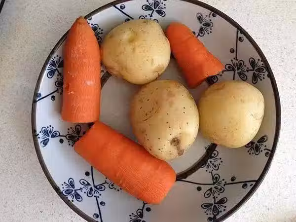 然後將胡蘿蔔和土豆去皮,壓泥,攪拌均勻。