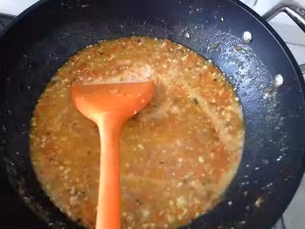 加入小半碗高湯攪勻;加鹽、糖,醋,攪勻;調中火,水開始有點滾了就加水澱粉勾芡,撒些白鬍椒粉攪勻。