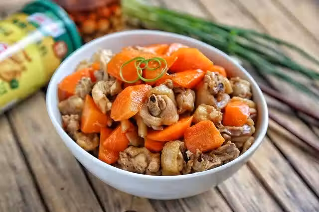 準備土雞半隻,胡蘿蔔1個,胡椒粉2克,醬油15克,蚝油10克,薑片3片,黃酒10克,鹽2克,清水半碗