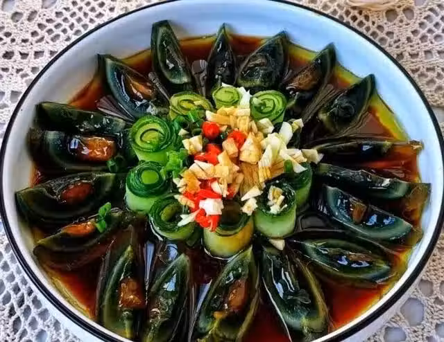 (2)皮蛋切好後在盤中均勻擺一圈,黃瓜片捲起來放入盤中間。