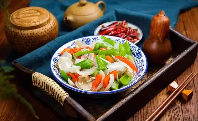 西芹炒百合配上紅菜椒,色彩鮮艷,口感豐富。這道菜肴清爽可口,富含纖維和多種營養物質,非常適合夏季食用。