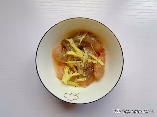 3.我買的新鮮的基圍蝦,去蝦頭蝦線蝦殼,放少許鹽,料酒,薑絲,黑胡椒碎拌勻腌10分鐘。