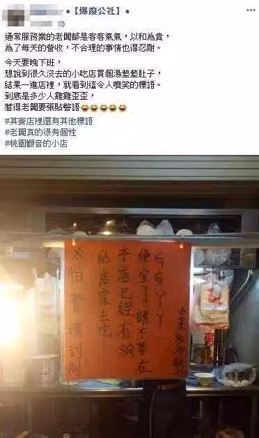 從照片中可以看到,有個性的老闆以一張紅紙作為公告,並在上頭寫著「怕貴請到別的店家去,本店已經有夠便宜了,請不要在GGYY」,對此也讓原Po忍不住笑問「到底是多少人雞雞歪歪,惹得老闆要張貼警語」,並在文末附上「老闆真的很有個性」的hasttag,透露這是一間位於桃園觀音處的小吃店。
