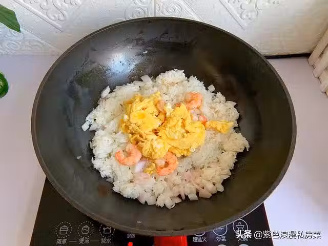 6.倒入炒好的雞蛋和蝦仁,翻炒。