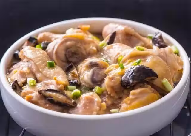 雞半隻、香菇、枸杞子、薑絲、蔥、玉米澱粉、米酒、蚝油、醬油、白鬍椒粉、麻油。