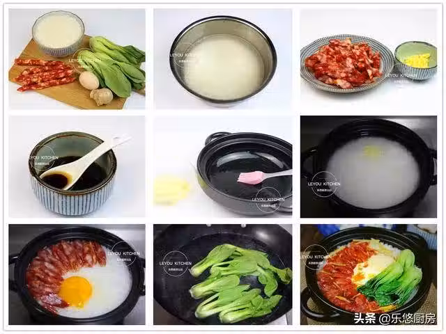 第七步:煮至米飯八分熟時,將臘腸放入鍋中,再放入一個雞蛋、少許薑絲,然後再次蓋好蓋子,小火燒5分鐘後關火燜15分鐘。