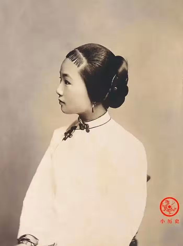 這位美女額前留短款劉海,腦後挽髻,頭髮一絲不亂,側對鏡頭,美麗動人,每一個細節都無可挑剔。她的裝扮比前文那位青樓女子更加時尚、更加清爽。