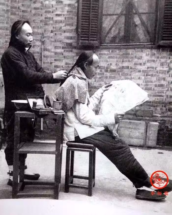 一位男子坐在椅子上,剃頭匠為他編辮子,同時看報紙。晚清時期,城市裡的報刊傳播日益發達,識字的市民也養成了讀報的習慣。