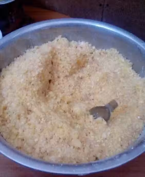 和完粿皮之後,製作裡面的餡,這裡是甜餡,主要是花生粉和綠豆粉加入少許糖一起攪拌均勻。也可用香飯為餡。小提示:香飯的米要糯米去弄,不然容易發酸