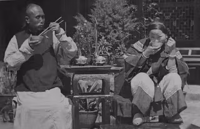 1902年,雲南昆明,一對夫妻面對鏡頭吃飯,應該是擺拍。