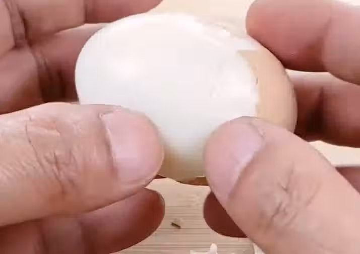 這里教大家一個剝雞蛋殼的小妙招,不用一點一點的摳,首先在雞蛋的正中間輕輕的磕破。然後用手蓋在雞蛋上面,把雞蛋滾動幾下,接著拿著雞蛋輕輕地向兩邊掰開,蛋殼很容易就脫離了雞蛋,很輕松的完整取出。