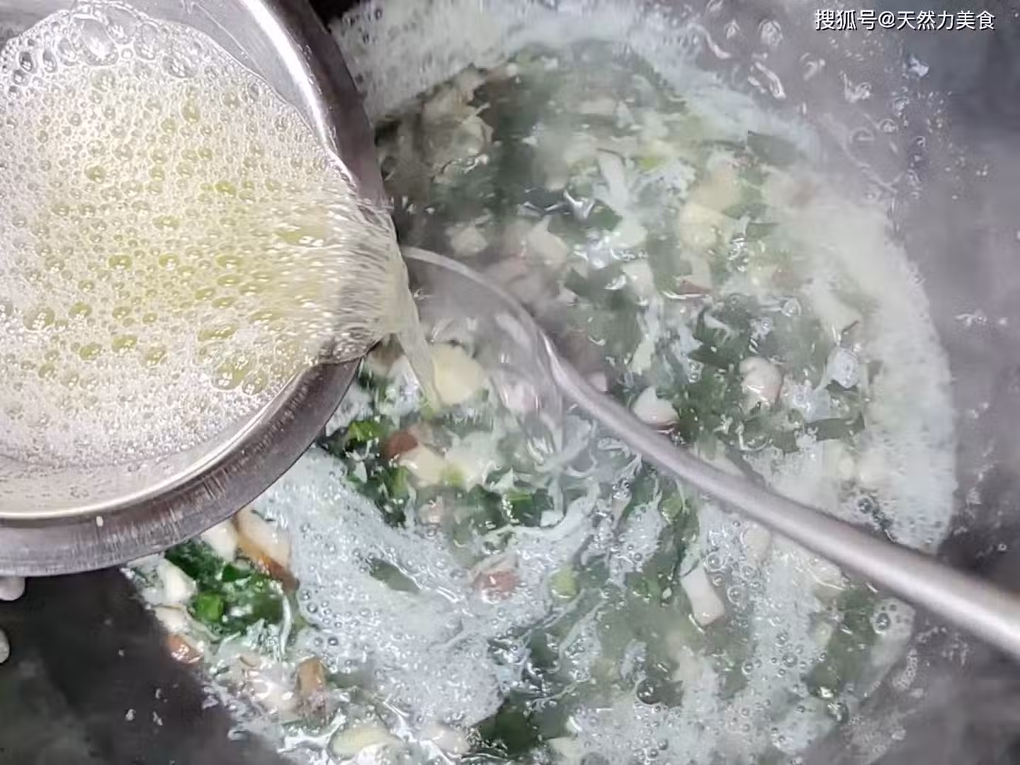 6、蛋清下鍋後會往下沉,但很快就會開始往上浮起來,所以只要看到鍋內的蛋花飄起來的時候就可以關火,最後淋上5克芝麻香油即可出鍋,美味即成。