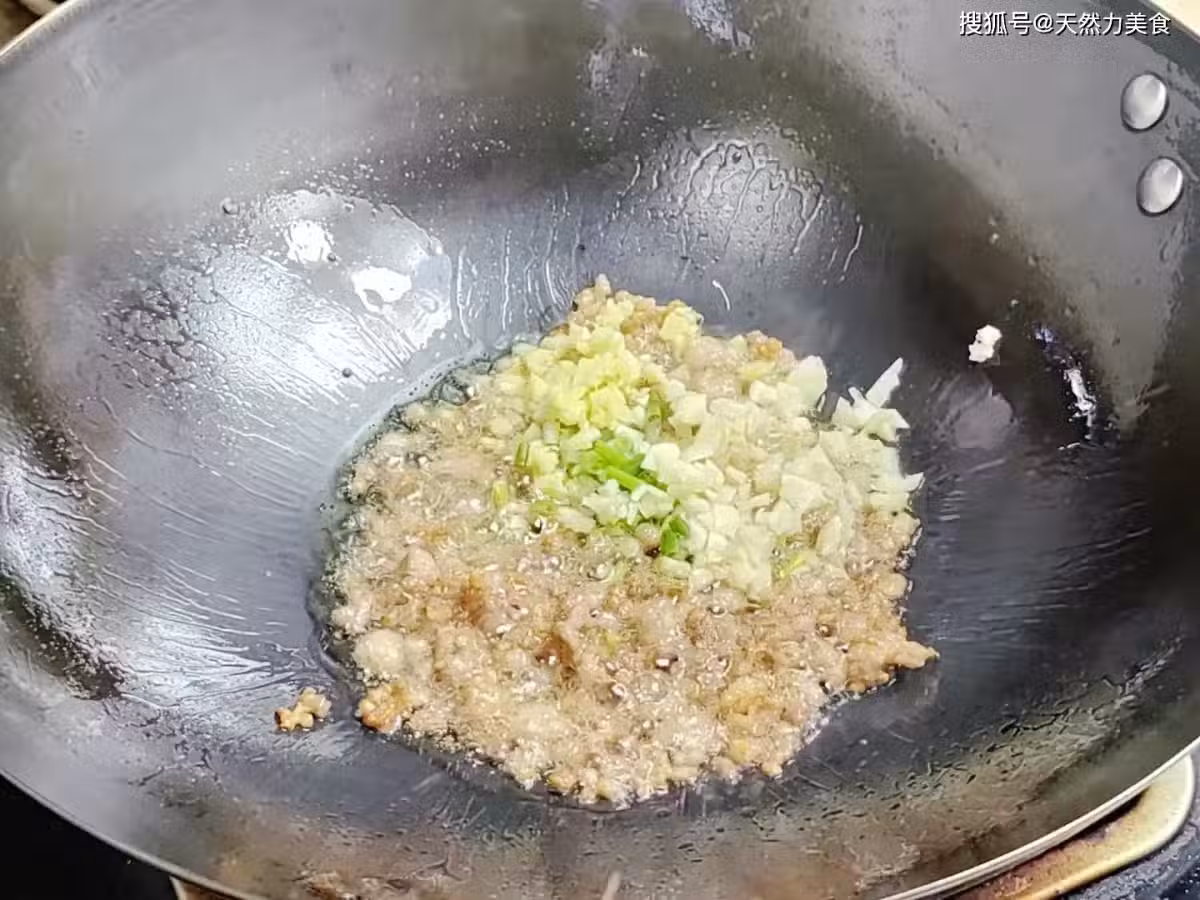 8、把香菇倒入鍋內,一起翻炒,把香菇的菌香味激發出來,香菇粒的體積也是比較小,這個過程最多有15秒左右香味就能出來。