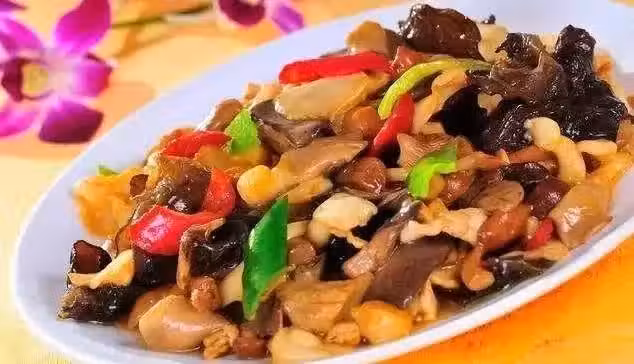 5.待散出味後加香菇炒幾下,再倒入對好的汁,待起泡時翻勻即成。