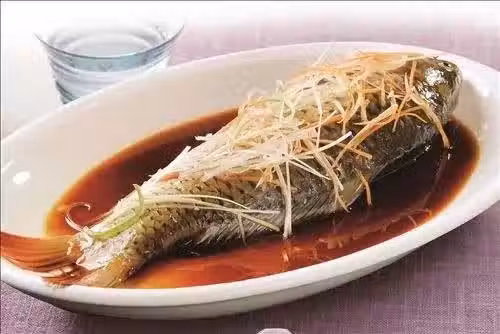 步驟5. 蒸鍋燒開,將鯉魚連盤子一起放於籠屜上大火蒸10分鐘,關火,不開蓋虛蒸5分鐘,撒上蔥絲及蒸魚豉油,再虛蒸5分鐘。