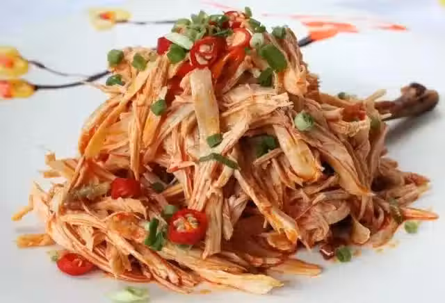 4.把涼透了的雞用手撕成小條,加木耳,倒入調味汁拌勻。