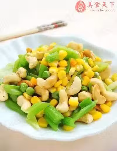 3、炒鍋倒入適量油,放入腰果,小火慢慢的炒熟,再放入玉米粒和芹菜段,加入鹽,味精,快速翻炒幾下就可以出鍋了。