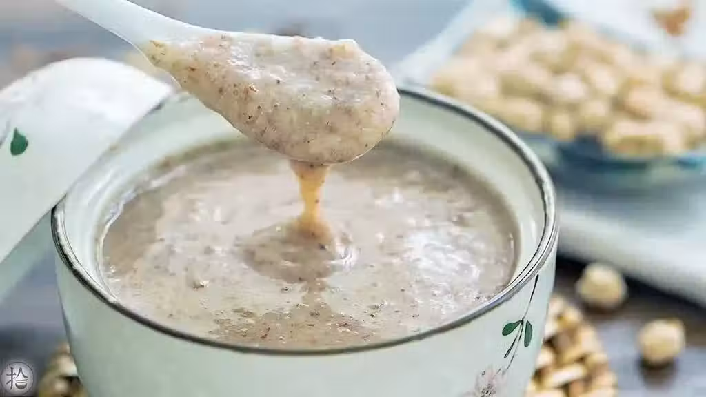 6. 放至溫熱後,倒入料理機,米湯酌量倒入,打成細膩的泥糊。