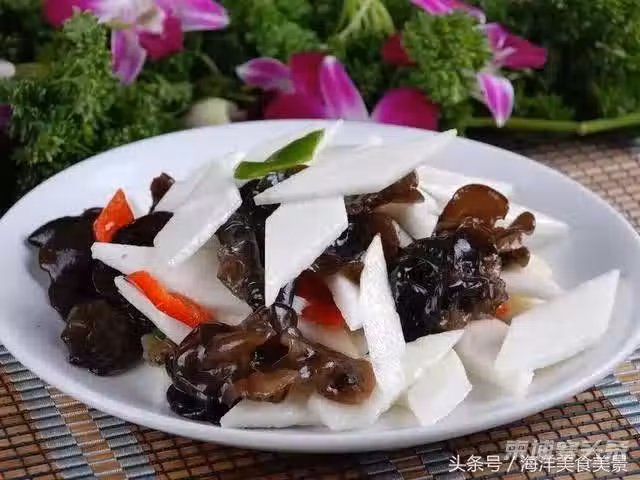 4、坐鍋加植物油燒熱,下薑絲爆香,倒入素蚝油山藥和木耳,撒上精鹽翻炒均勻,勾薄芡,放味精,淋明油出鍋裝盤。