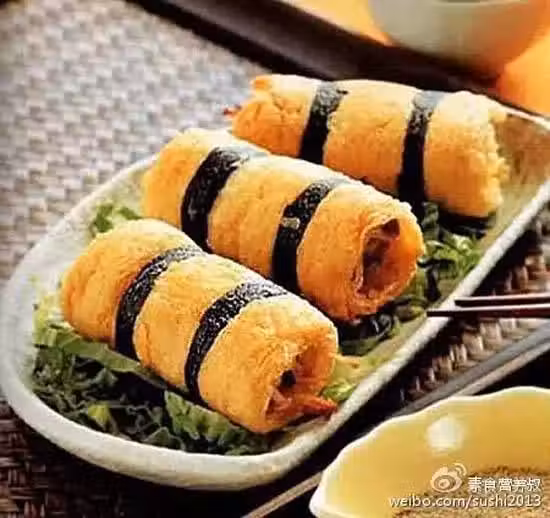4、紫菜條面端沾少許麵糊,裹住豆包卷(每卷裹兩條紫菜),入油鍋小火煎熟即可。