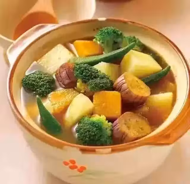 食材:花椰菜150克,馬鈴薯150克,地瓜150克,秋葵100克,茄子200克,咖喱粉3大匙,素高湯400毫升,椰漿50毫升,鹽1/2茶匙