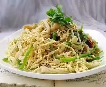 原料:金針菇150克、豆腐百葉絲5片(或豆腐乾絲) 、青椒、芹菜葉、生抽2大匙、香油1大匙
