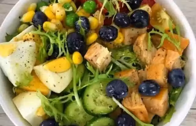 食材:苦菊,雞胸肉,黃瓜,玉米粒,豌豆,番茄,藍莓,雞蛋