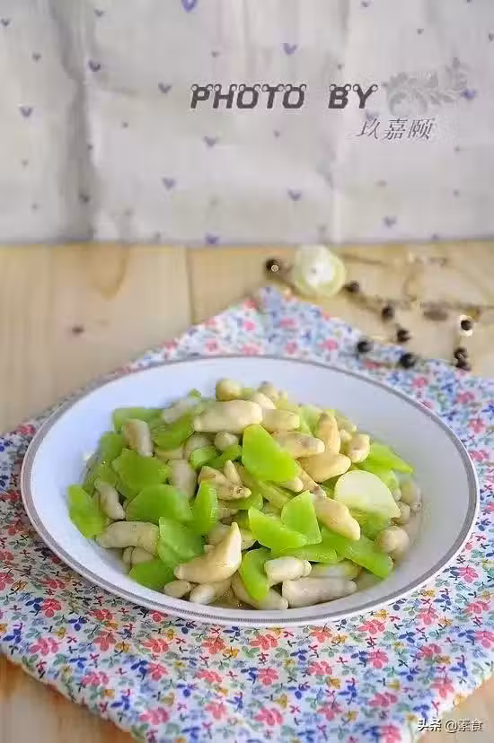 6. 放入萵筍片,放少許鹽、蔬果粉翻炒均勻;