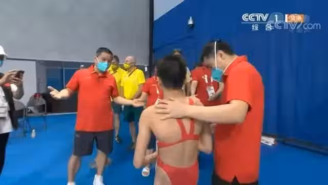 在一旁看著的外國教練們,眼巴巴地望著這一幕,眼睛都直勾勾地看著全紅嬋,估計內心是這麼想的:這小孩太厲害了,為什麼是別人家的小孩!我也想要這麼厲害的選手!
