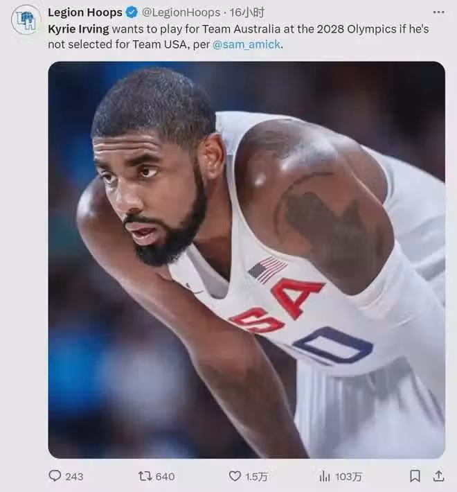 獨行俠後衛凱里-歐文,近日接受TA名記Sam Amick的專訪。歐文表示,自己對落選巴黎奧運會有一點失望,但是他不放棄2028年為美國男籃出戰。如果2028年奧運會不能為美國男籃出戰,那麼自己願意為澳大利亞男籃打球。