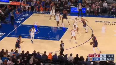 利用蘭德爾的掩護,格蘭姆斯擺脫了米切爾的追防但所投出的三分還是以打鐵告終。不過,哈特搶下了前場籃板讓尼克斯繼續擁有球權。