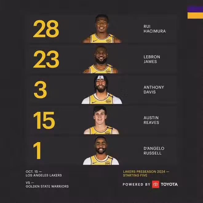10月16日上午10點,備受關注的一場NBA季前賽開打:湖人vs勇士。此前遭遇腳踝扭傷的里夫斯今天復出,但是有出場時間限制。湖人上半場繼續使用9人輪換,本場首發:拉塞爾、里夫斯、八村塁、詹姆斯、濃眉。
