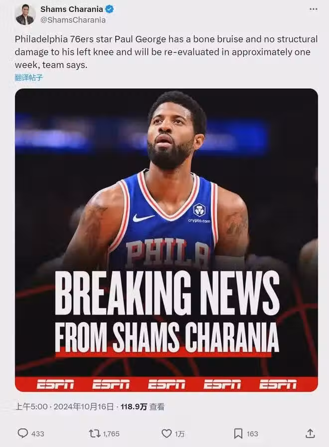 10月16日,費城76人隊官方宣布:遭遇左膝骨挫傷,將在一周後重新接受評估。經核磁共振檢查,他沒有遭遇結構性損傷。76人還剩2場季前賽,喬治肯定不打了。一周後常規賽揭幕,喬治夠嗆能打,他大機率11月初復出。
