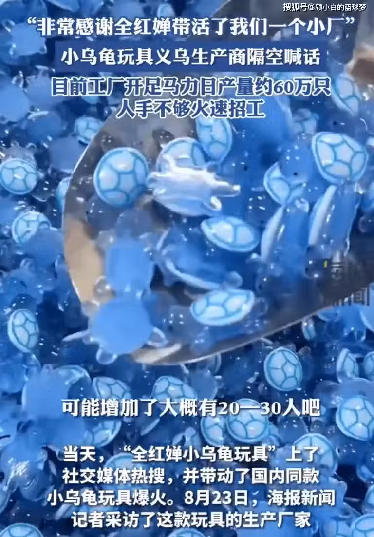 原本夏季是義烏淡季,沒想到今夏是從業三年獨一份的火爆,原本工廠只有300人,因為全紅嬋的視頻讓工廠多招100多人,日產烏龜60萬隻。