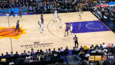 二番戰太陽,對詹姆斯來說是有驚無險。很重要一點:三節打完11投2中僅得到6分。甚至於,離全場結束還有2分鐘時詹姆斯才得到7分。潛在的,連續得分上雙記錄要斷。