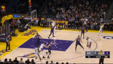 正如這個回合,當里夫斯帶走德羅贊後為濃眉的持球突破拉開空間。最終後者一路攆著小薩博尼斯打成「2+1」。