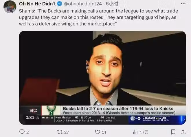 11月10日,ESPN名記Shams在節目中說道:「雄鹿已經通知全聯盟尋求交易機會,目標是補強後衛和防守型側翼!」另一記者Brian Windhorst也表示:「有球隊高管透露,雄鹿確實在聯盟中尋求交易,但是送走字母哥的時機並未成熟。」