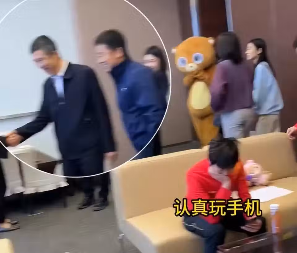 領導進入會議室接待咱們的奧運冠軍,這時候的全紅嬋還處於等待狀態,全程認真玩手機。